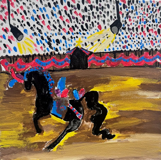 Showtime Stallion is a dynamic arena scene featuring a prancing black horse decked out in bright blue, red, and pink decorations under a dazzling sky of colorful dots and spotlights. Ellie filled the ring with warm golds and browns so it looks like the ground is glowing beneath the horse’s hooves, while a row of bunting and a little center building in the background make the whole place feel like a festive show or circus. The curved tail, raised legs, and dramatic lighting capture that moment when all eyes are on the performer — confident, bold, and full of energy.